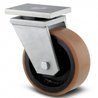 Поворотный ролик, кронштейн и пластина сварные из стали, цинковое пассивированное покрытие, герметизированный подшипник поворотного узла с сдвоенным подшипником и конусным роликовым подшипником, резьбовой шкворень с запорной гайкой, ниппель для смазки, ось колеса с гайкой, крепежная панель. Центр колеса из чугуна, Протектор: Полиуретан, литой, прецизионный шарикоподшипник
