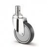 Поворотный ролик, кронштейн из прессованной стали, блестящее оцинкованное пассивированное голубым покрытие, двухрядный шарикоподшипник в поворотном узле, ось колеса на болту, соединение на прочной заглушке. Центр колеса из Полипропилена, Протектор: ТЕНТЕпрен (термопластичная резина), серая не оставляющая следов, прецизионный шарикоподшипник , с защитными колпаками