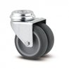 Поворотный ролик, кронштейн из прессованной стали, блестящее оцинкованное пассивированное голубым покрытие, двойной шарикоподшипник в поворотном узле, ось колеса на болту, отверстие под болт. Центр колеса из Полипропилена, Протектор: ТЕНТЕпрен (термопластичная резина), серая не оставляющая следов, подшипник скольжения