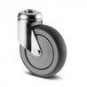 Поворотный ролик, кронштейн из прессованной стали, блестящее оцинкованное пассивированное голубым покрытие, двойной шарикоподшипник в поворотном узле, ось колеса на болту, отверстие под болт. Центр колеса из Полипропилена, Протектор: ТЕНТЕпрен (термопластичная резина), серая не оставляющая следов, прецизионный шарикоподшипник , с защитными колпаками