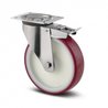 Поворотный ролик с общим тормозом "позадиидущий", кронштейн изготовлен из нержавеющей стали, поворотная головка на двойном шарикоподшипнике, защищенные, усиленные и закаленные шарики, скреплена кованой заклепкой, ось колеса на болту, крепежная панель. Центр колеса из Полиамида, Протектор: Полиуретан, сиреневый, роликовый подшипник, нержавеющая сталь